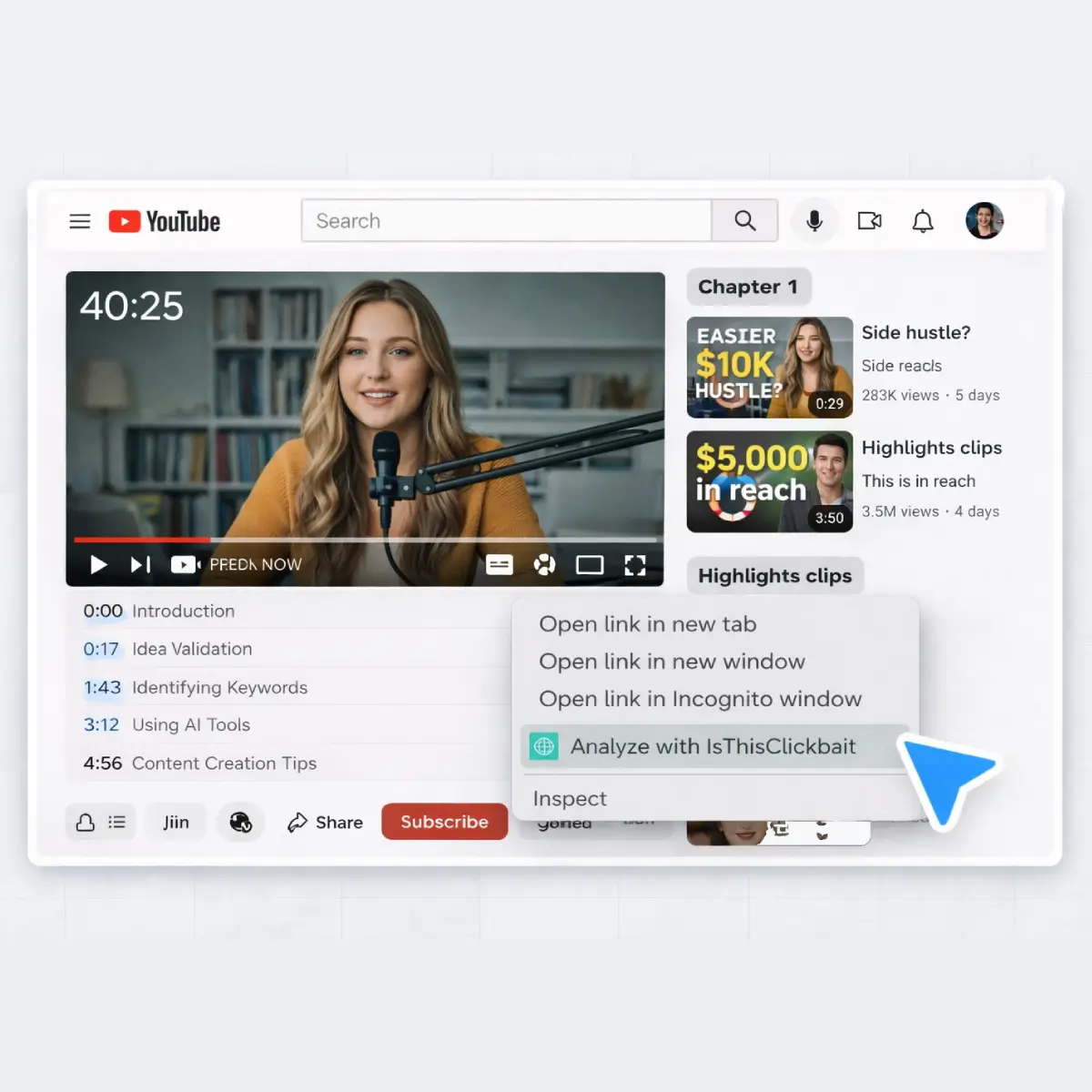 - IsThisClickbait helps you see what’s inside a video fast, spot must-watch moments, and sanity-check titles against content.