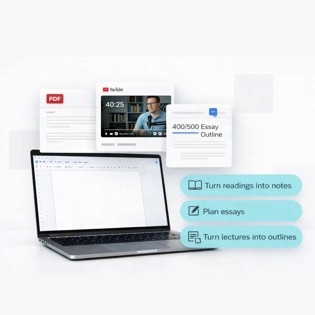 A student turning long readings and highlighted printouts into a clear outline on their laptop.