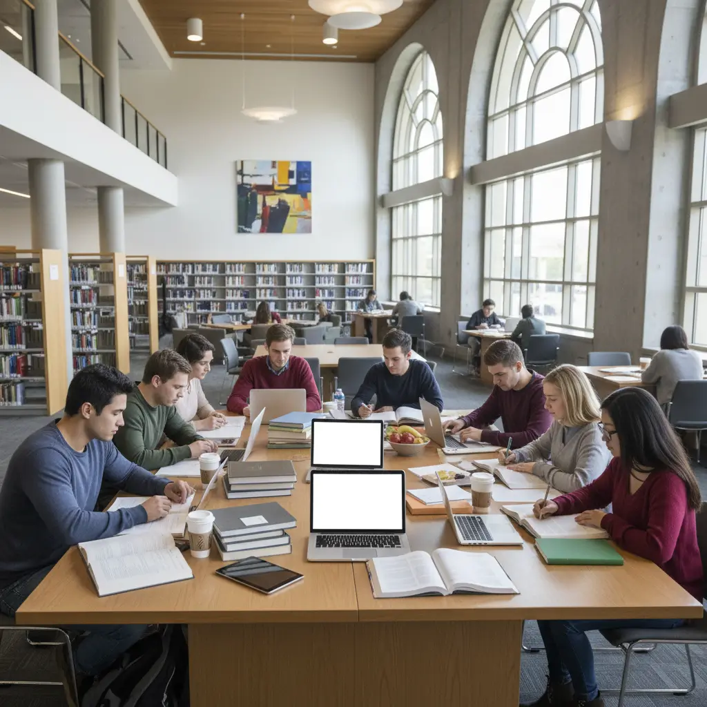 Diverse college students using laptops, readings, and notes to organize their study workload.